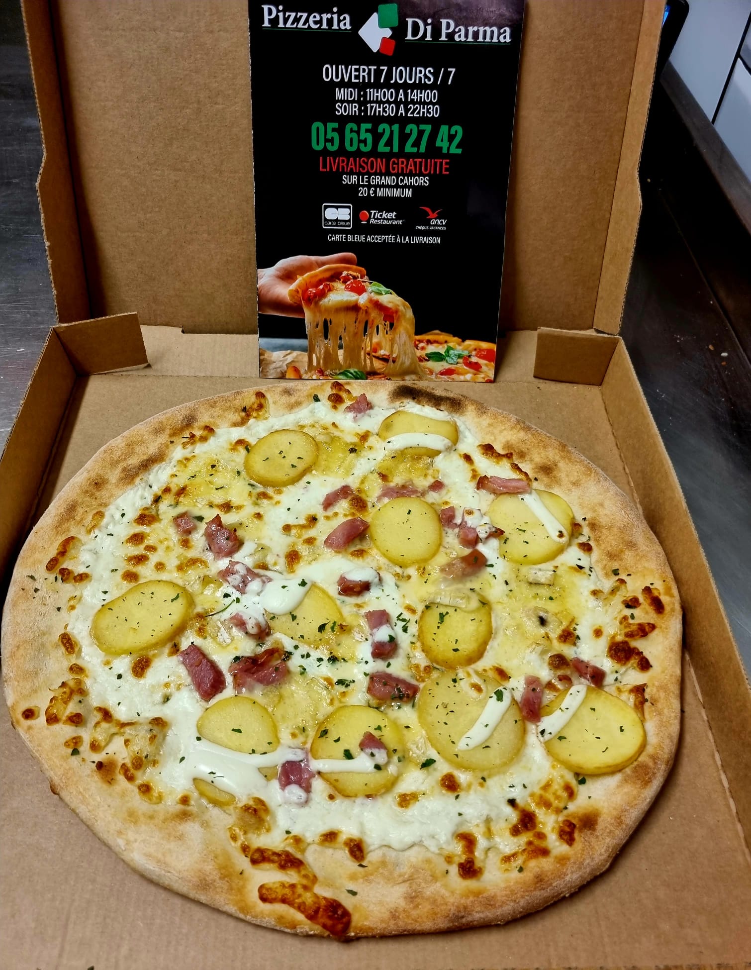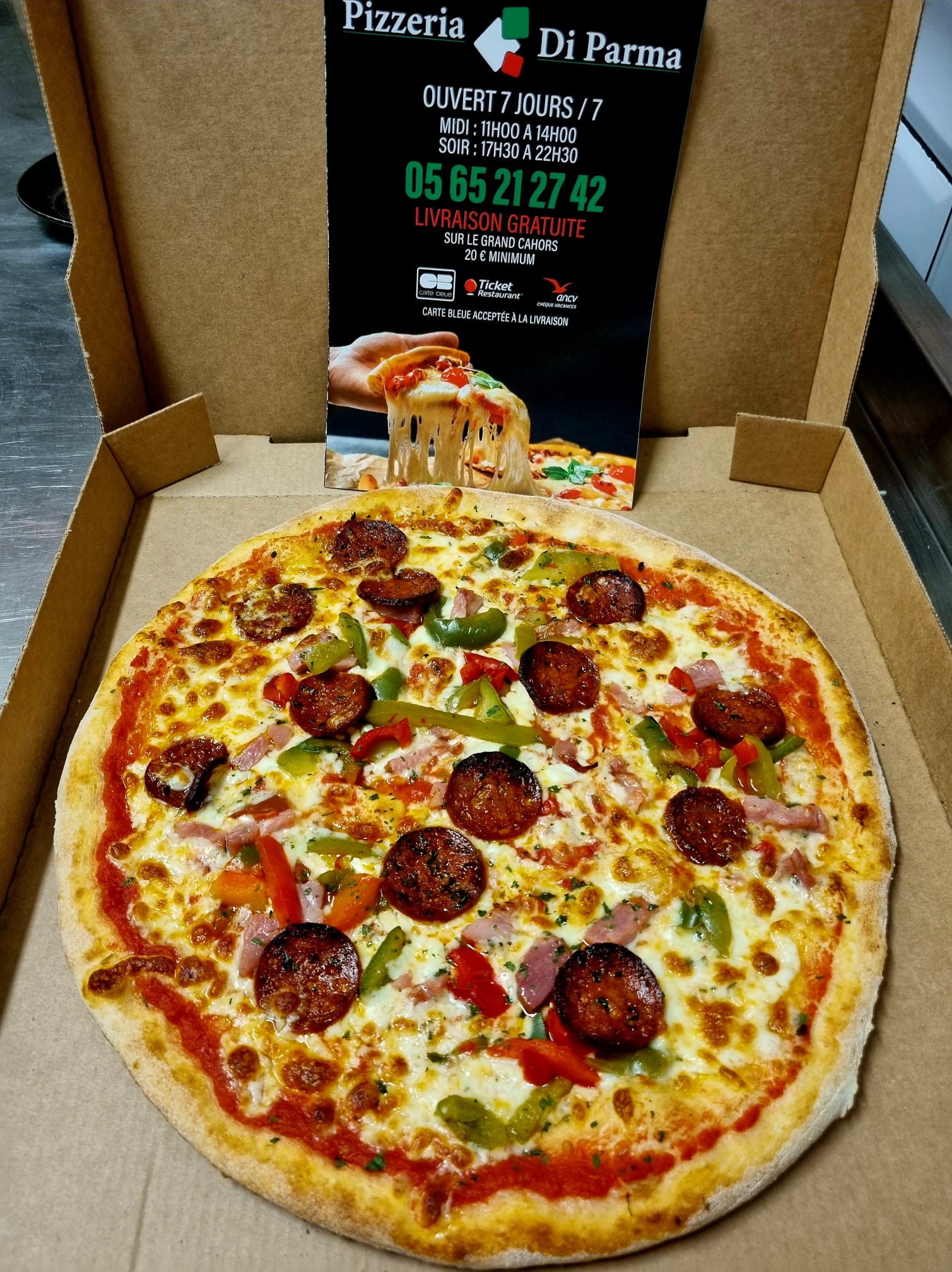 La pizzeria Di Parma vous propose une carte variée de pizzas pour tous les goûts avec une quarantaine de pizzas aux saveurs variées. Nous offrons également un large choix de boissons pour accompagner votre pizza. Nous sommes également fiers de proposer un service de livraison rapide et efficace pour que vous puissiez déguster nos pizzas artisanales dans le confort de votre foyer.